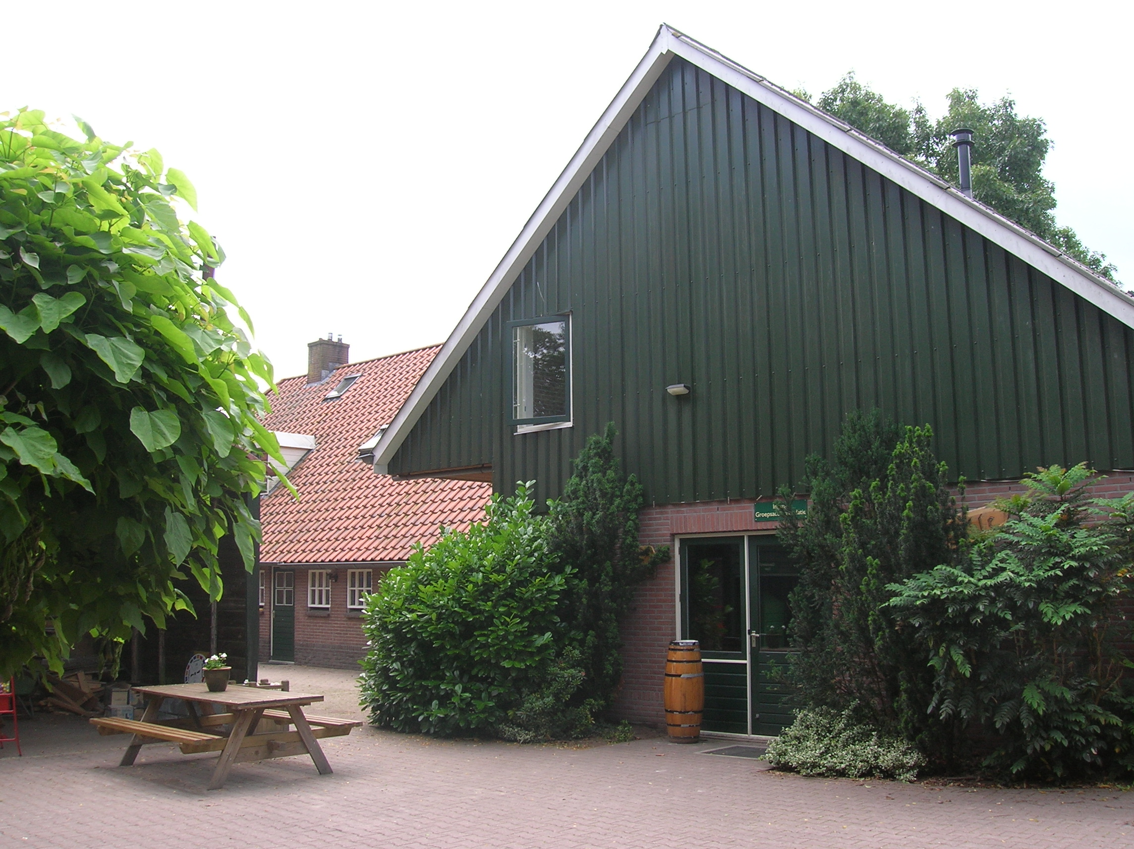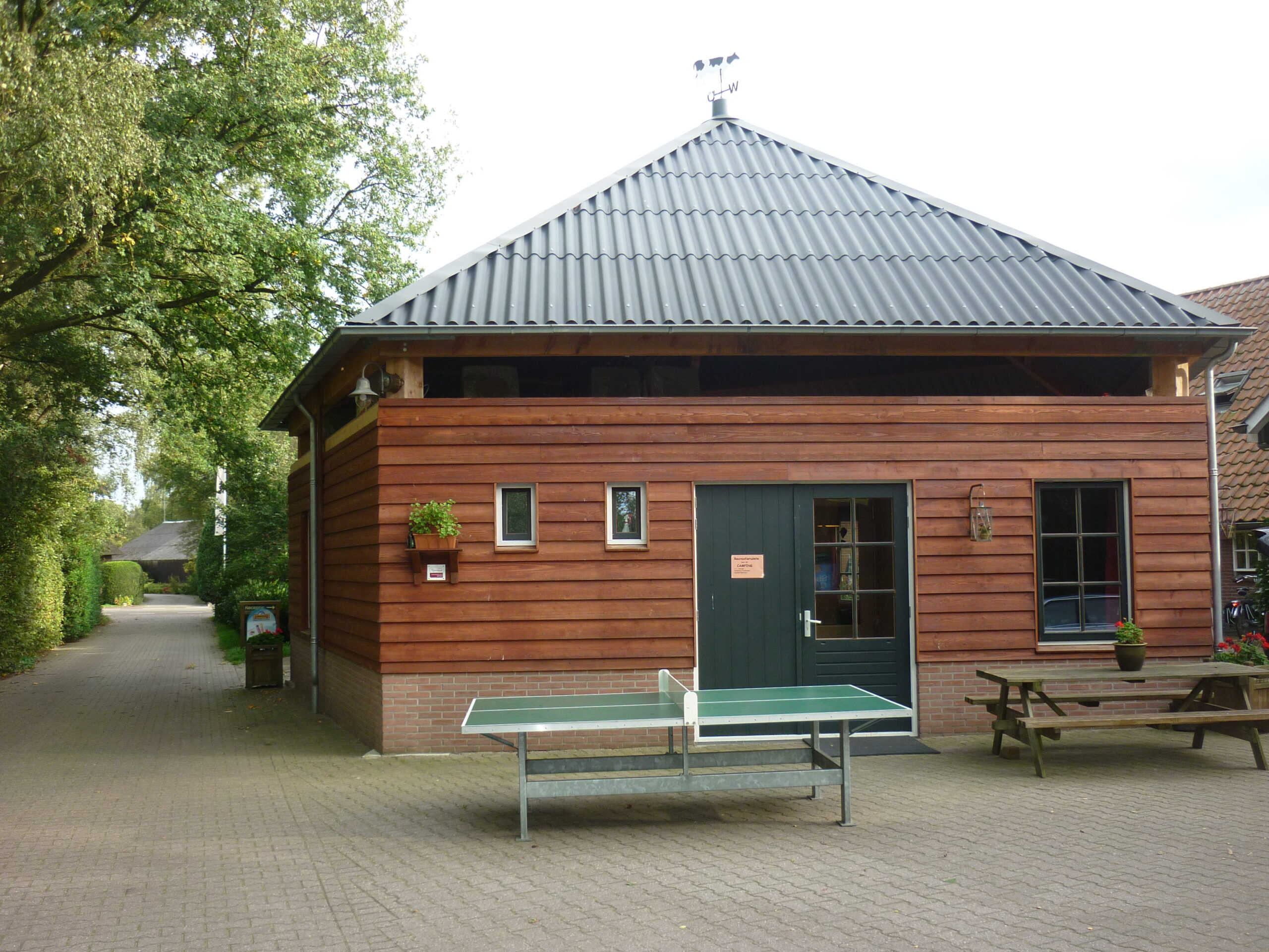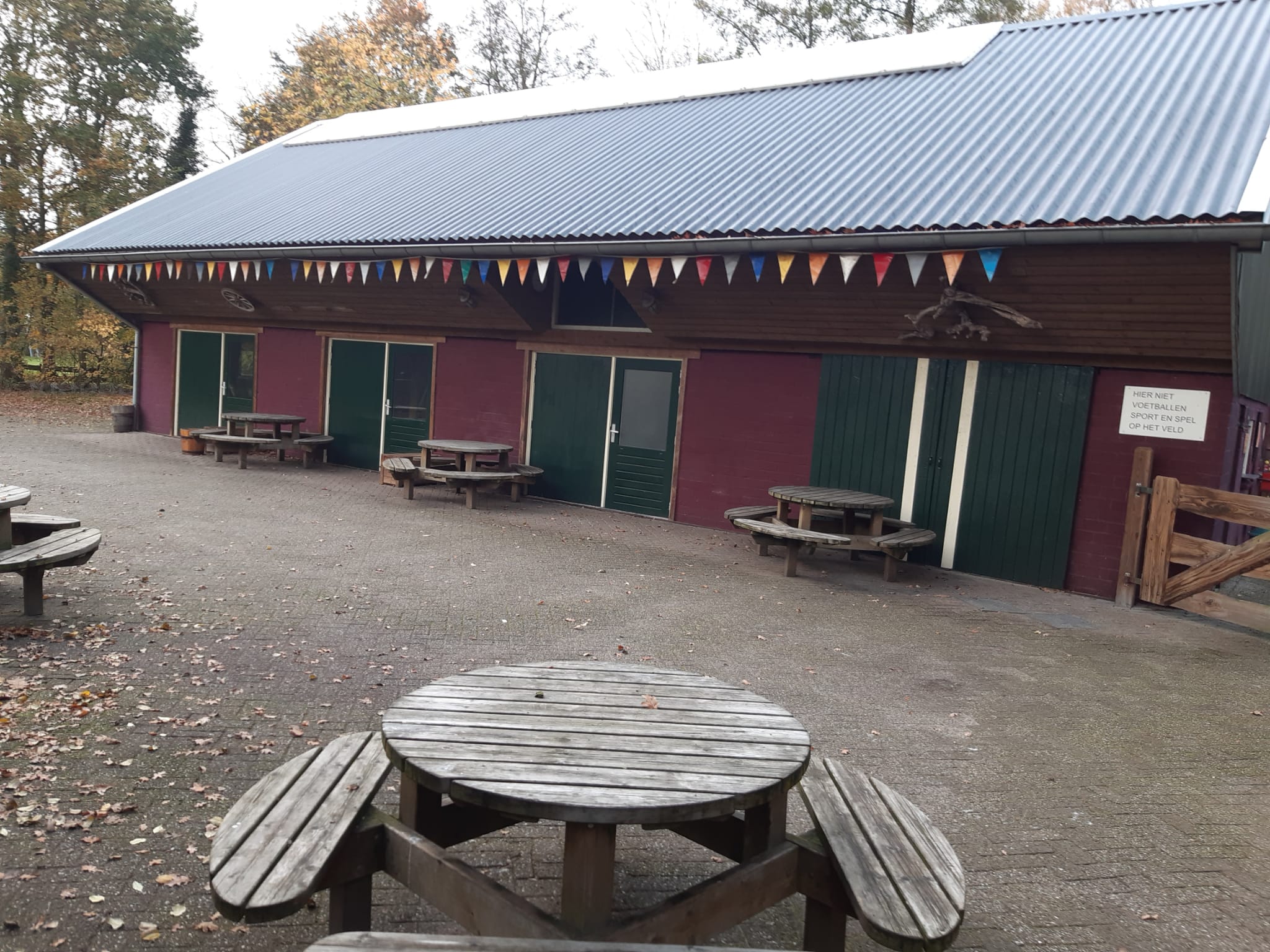 Aan de voorzijde van het terrein is de ruime groepsaccommodatie gevestigd. Deze accommodatie met bouwjaar 1997 is goed onderhouden, onder andere door de in 2020 volledig opnieuw ingerichte zaal. Het pand is aangesloten op CV. Opgetrokken uit steen en voorzien van een pannendak maakt dit twee-laags opgebouwde gebouw dankzij de praktische indeling uitermate geschikt tot het huisvesten van grotere groepen als scholen en verenigingen.